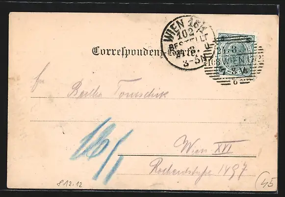 Personenbezogene Daten auf der Rückseite der Karte wurden durch blauen Textmarker unkenntlich gemacht. Die blauen Stellen sind auf die Vorderseite durchgeweicht und wirken sich negativ auf das Postkartenfoto aus