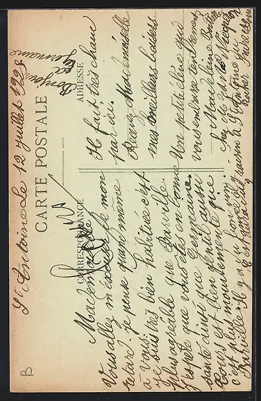Personenbezogene Daten auf der Rückseite der Karte wurden durch blauen Textmarker unkenntlich gemacht. Die blauen Stellen sind auf die Vorderseite durchgeweicht und wirken sich negativ auf das Postkartenfoto aus