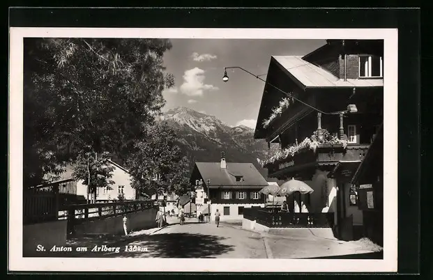 AK St. Anton a. Arlberg, Ortsansicht mit Gasthof Alpenrose
