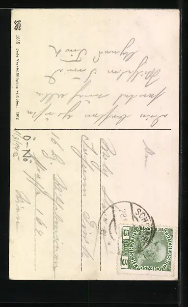 Personenbezogene Daten auf der Rückseite der Karte wurden durch blauen Textmarker unkenntlich gemacht. Die blauen Stellen sind auf die Vorderseite durchgeweicht und wirken sich negativ auf das Postkartenfoto aus