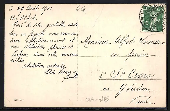 gelaufen 1913, Eckknick oben li., guter Zustand