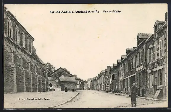 AK St-Aubin-d’Aubigné, Rue de l`Église avec bâtiments et passant