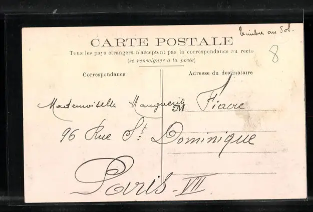 Personenbezogene Daten auf der Rückseite der Karte wurden durch blauen Textmarker unkenntlich gemacht. Die blauen Stellen sind auf die Vorderseite durchgeweicht und wirken sich negativ auf das Postkartenfoto aus