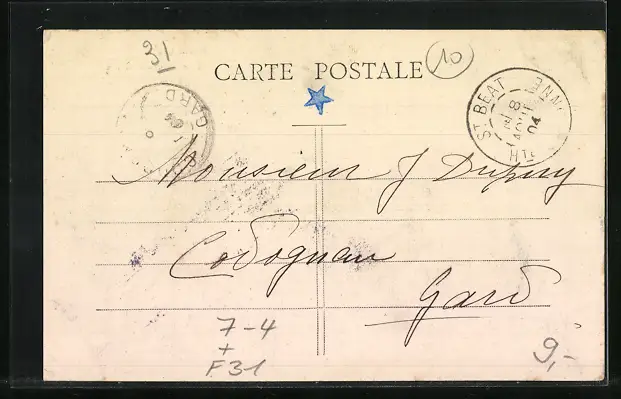 Personenbezogene Daten auf der Rückseite der Karte wurden durch blauen Textmarker unkenntlich gemacht. Die blauen Stellen sind auf die Vorderseite durchgeweicht und wirken sich negativ auf das Postkartenfoto aus
