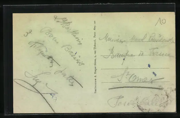 Personenbezogene Daten auf der Rückseite der Karte wurden durch blauen Textmarker unkenntlich gemacht. Die blauen Stellen sind auf die Vorderseite durchgeweicht und wirken sich negativ auf das Postkartenfoto aus