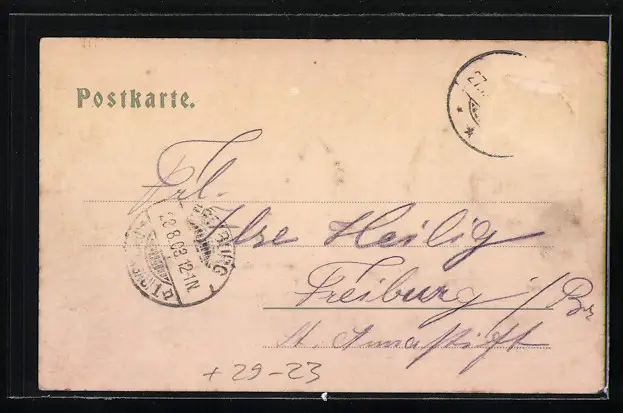 Personenbezogene Daten auf der Rückseite der Karte wurden durch blauen Textmarker unkenntlich gemacht. Die blauen Stellen sind auf die Vorderseite durchgeweicht und wirken sich negativ auf das Postkartenfoto aus