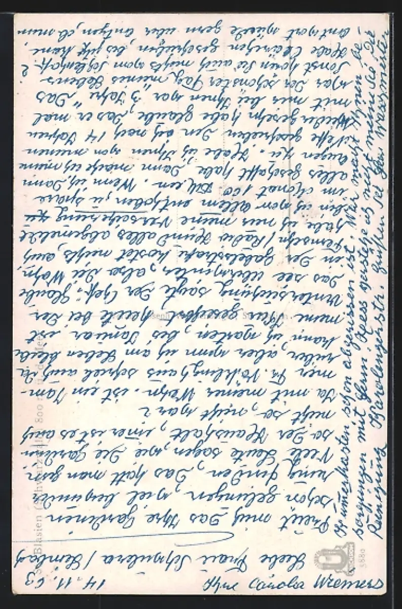 Personenbezogene Daten auf der Rückseite der Karte wurden durch blauen Textmarker unkenntlich gemacht. Die blauen Stellen sind auf die Vorderseite durchgeweicht und wirken sich negativ auf das Postkartenfoto aus