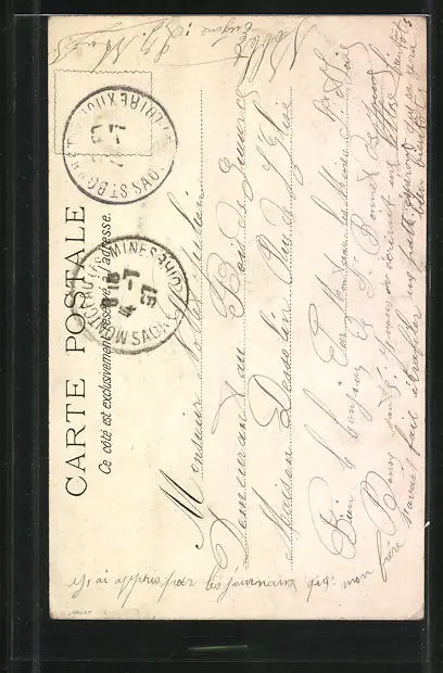 Personenbezogene Daten auf der Rückseite der Karte wurden durch blauen Textmarker unkenntlich gemacht. Die blauen Stellen sind auf die Vorderseite durchgeweicht und wirken sich negativ auf das Postkartenfoto aus