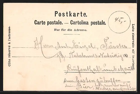 Personenbezogene Daten auf der Rückseite der Karte wurden durch blauen Textmarker unkenntlich gemacht. Die blauen Stellen sind auf die Vorderseite durchgeweicht und wirken sich negativ auf das Postkartenfoto aus