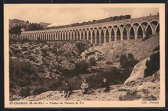 AK St-Chamas, Viaduc du Chemin de Fer avec train en passage