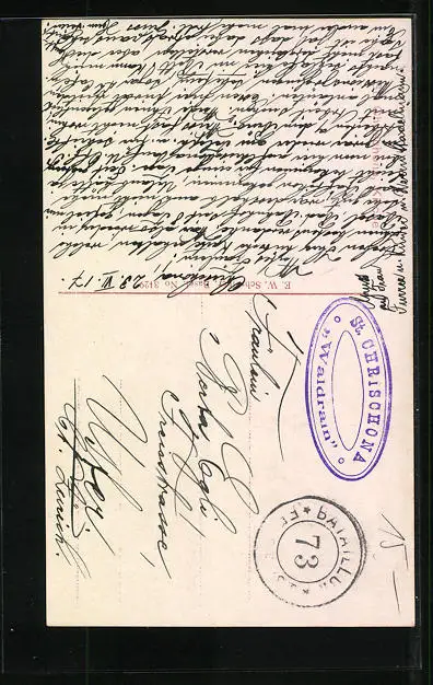 Personenbezogene Daten auf der Rückseite der Karte wurden durch blauen Textmarker unkenntlich gemacht. Die blauen Stellen sind auf die Vorderseite durchgeweicht und wirken sich negativ auf das Postkartenfoto aus