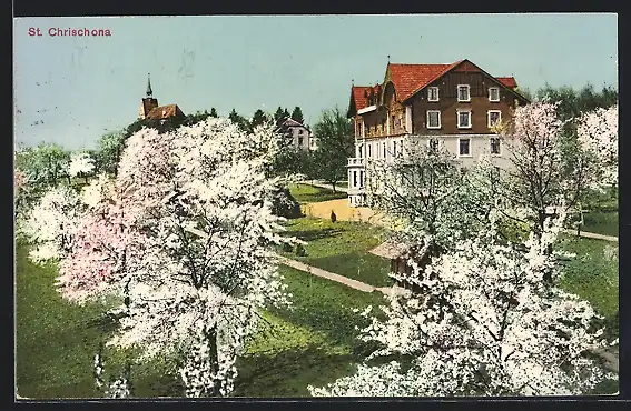 AK St. Chrischona, Wohnhaus während der Baumblüte