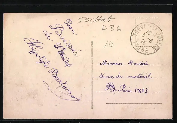 Personenbezogene Daten auf der Rückseite der Karte wurden durch blauen Textmarker unkenntlich gemacht. Die blauen Stellen sind auf die Vorderseite durchgeweicht und wirken sich negativ auf das Postkartenfoto aus