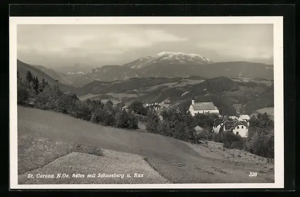 AK St. Corona, Gesamtansicht mit Schneeberg und Rax
