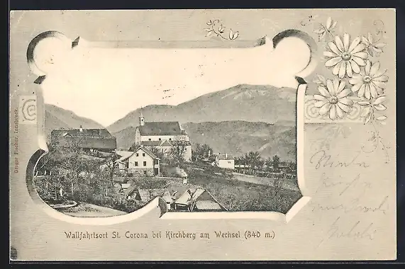 AK St. Corona am Kirchberg, Ortspartie mit Kirche, Gänseblumen, Passepartout