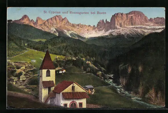 AK St. Cyprian bei Bozen, Ortspartie mit Blick zum Rosengarten