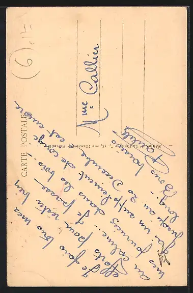 Personenbezogene Daten auf der Rückseite der Karte wurden durch blauen Textmarker unkenntlich gemacht. Die blauen Stellen sind auf die Vorderseite durchgeweicht und wirken sich negativ auf das Postkartenfoto aus