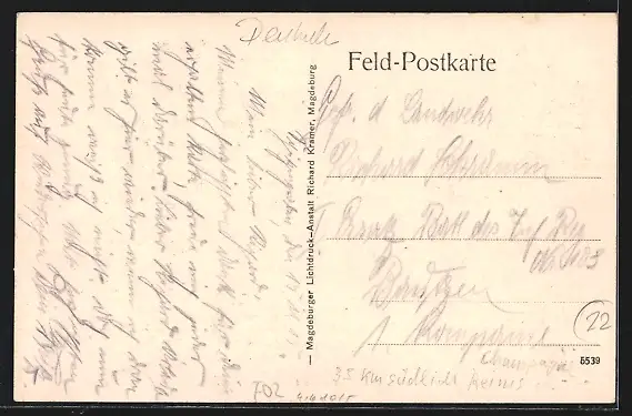 Personenbezogene Daten auf der Rückseite der Karte wurden durch blauen Textmarker unkenntlich gemacht. Die blauen Stellen sind auf die Vorderseite durchgeweicht und wirken sich negativ auf das Postkartenfoto aus