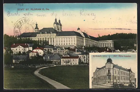 AK St. Florian /O. Oe., Sparkasse, Ortsansicht mit Stift