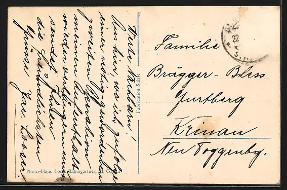 Personenbezogene Daten auf der Rückseite der Karte wurden durch blauen Textmarker unkenntlich gemacht. Die blauen Stellen sind auf die Vorderseite durchgeweicht und wirken sich negativ auf das Postkartenfoto aus