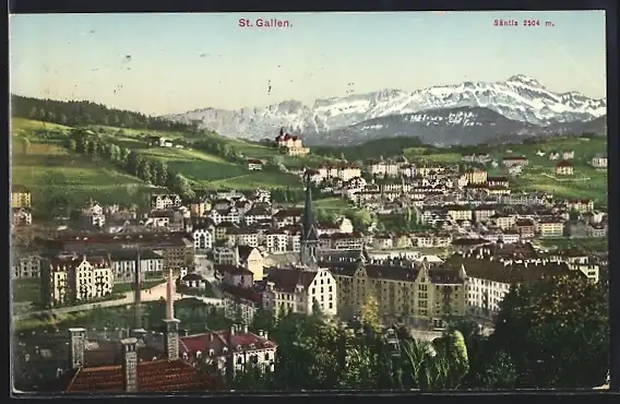 AK St. Gallen, Ortsansicht mit Kirche und Säntis
