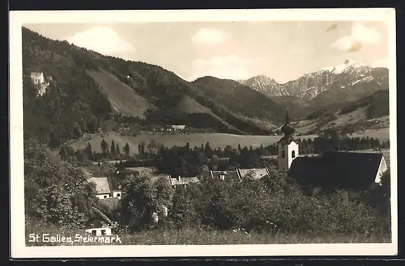 AK St. Gallen /Stmk., Teilansicht mit Kirche und Umgebung