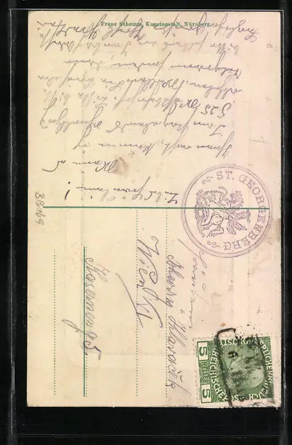Personenbezogene Daten auf der Rückseite der Karte wurden durch blauen Textmarker unkenntlich gemacht. Die blauen Stellen sind auf die Vorderseite durchgeweicht und wirken sich negativ auf das Postkartenfoto aus