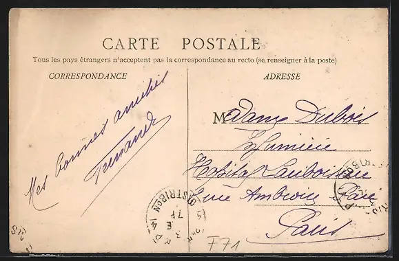 Personenbezogene Daten auf der Rückseite der Karte wurden durch blauen Textmarker unkenntlich gemacht. Die blauen Stellen sind auf die Vorderseite durchgeweicht und wirken sich negativ auf das Postkartenfoto aus