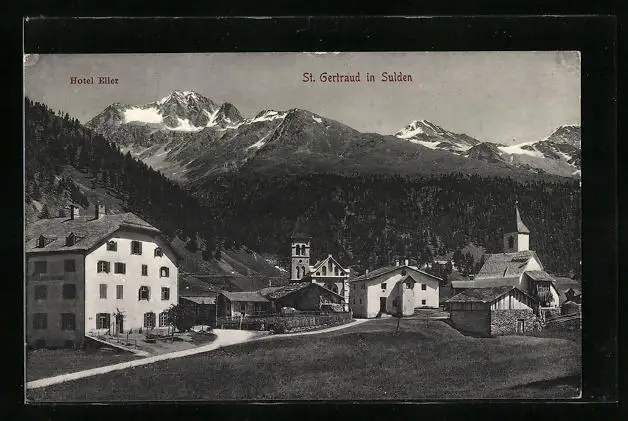 AK St. Gertraud in Sulden, Teilansicht mit Hotel Eller