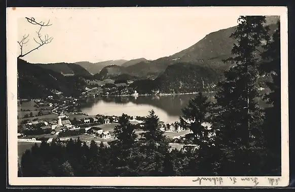 AK St. Gilgen am Abersee, Teilansicht mit Bergen