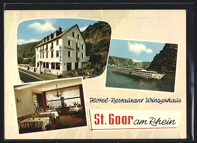 AK St. Goar /Rhein, Hotel-Restaurant Winzerhaus, Dampfer auf dem Rhein