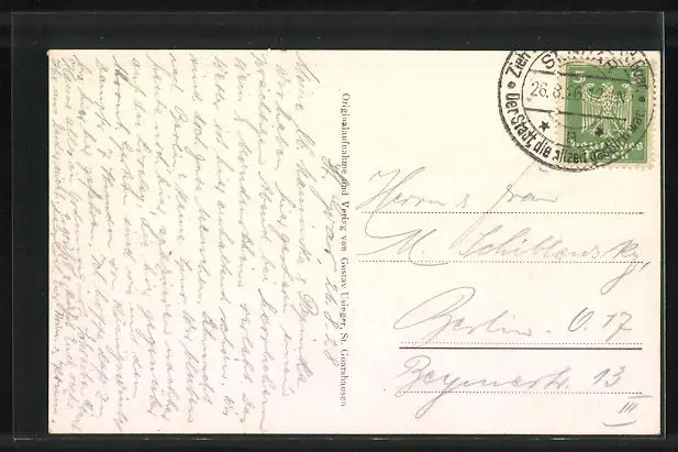 Personenbezogene Daten auf der Rückseite der Karte wurden durch blauen Textmarker unkenntlich gemacht. Die blauen Stellen sind auf die Vorderseite durchgeweicht und wirken sich negativ auf das Postkartenfoto aus