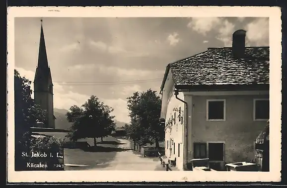 AK St. Jakob i. L., Ortspartie mit Blick zur Kirche