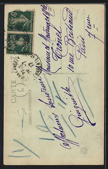 Personenbezogene Daten auf der Rückseite der Karte wurden durch blauen Textmarker unkenntlich gemacht. Die blauen Stellen sind auf die Vorderseite durchgeweicht und wirken sich negativ auf das Postkartenfoto aus