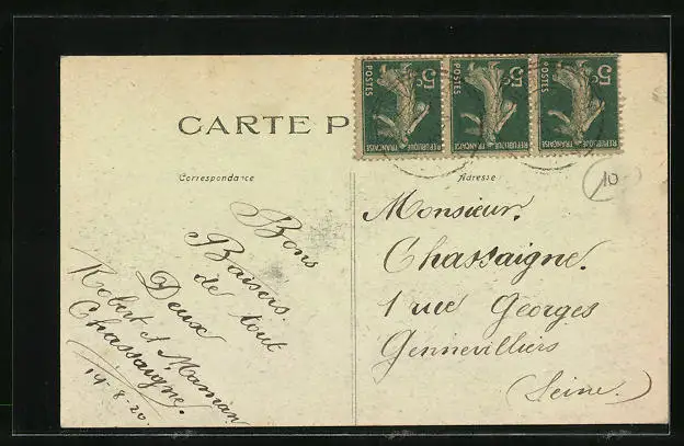 Personenbezogene Daten auf der Rückseite der Karte wurden durch blauen Textmarker unkenntlich gemacht. Die blauen Stellen sind auf die Vorderseite durchgeweicht und wirken sich negativ auf das Postkartenfoto aus