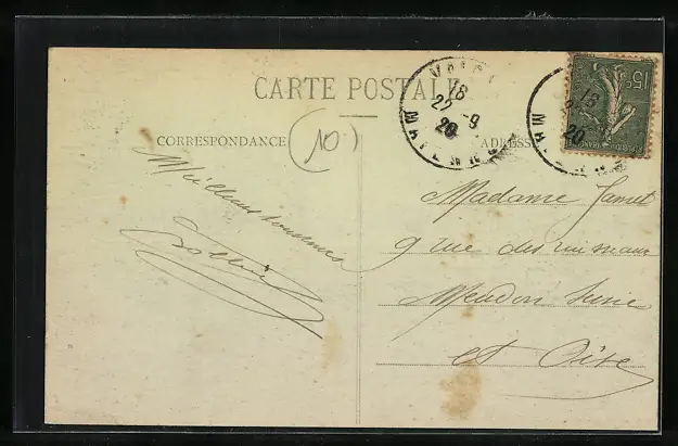 Personenbezogene Daten auf der Rückseite der Karte wurden durch blauen Textmarker unkenntlich gemacht. Die blauen Stellen sind auf die Vorderseite durchgeweicht und wirken sich negativ auf das Postkartenfoto aus