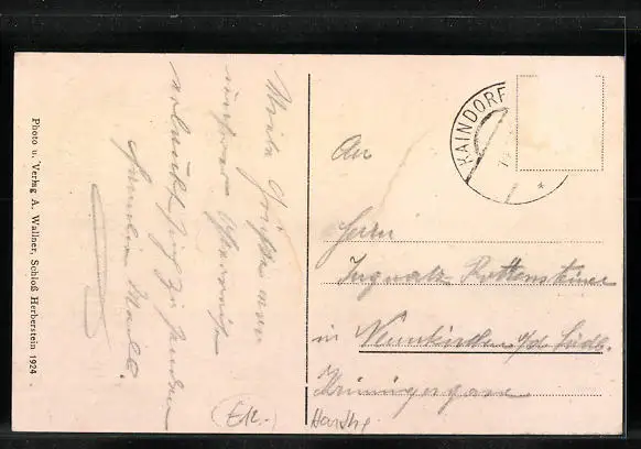 Personenbezogene Daten auf der Rückseite der Karte wurden durch blauen Textmarker unkenntlich gemacht. Die blauen Stellen sind auf die Vorderseite durchgeweicht und wirken sich negativ auf das Postkartenfoto aus