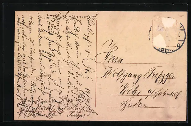 alte Ansichtskarte, gelaufen, Briefmarke entfernt, rückseitig Oberflächenschaden, guter Zustand