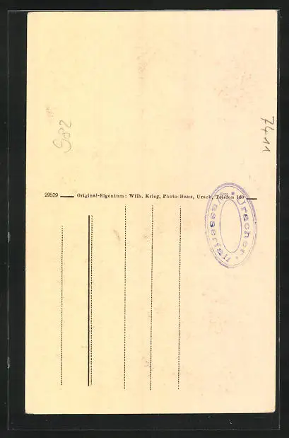 Personenbezogene Daten auf der Rückseite der Karte wurden durch blauen Textmarker unkenntlich gemacht. Die blauen Stellen sind auf die Vorderseite durchgeweicht und wirken sich negativ auf das Postkartenfoto aus
