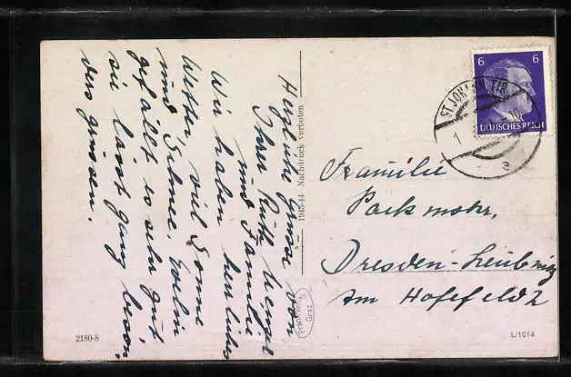 Personenbezogene Daten auf der Rückseite der Karte wurden durch blauen Textmarker unkenntlich gemacht. Die blauen Stellen sind auf die Vorderseite durchgeweicht und wirken sich negativ auf das Postkartenfoto aus
