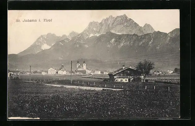 AK St. Johann, Ortspartie mit Kirche und Bergen