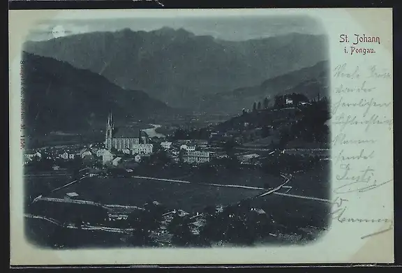 AK St. Johann /Pongau, Ortsansicht aus der Vogelschau mit Bergwand