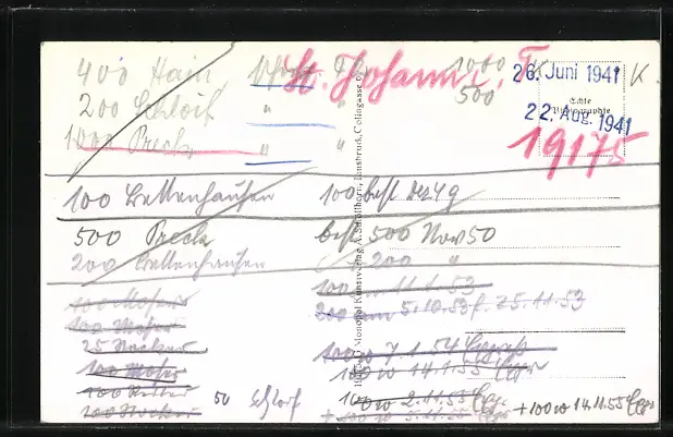Personenbezogene Daten auf der Rückseite der Karte wurden durch blauen Textmarker unkenntlich gemacht. Die blauen Stellen sind auf die Vorderseite durchgeweicht und wirken sich negativ auf das Postkartenfoto aus