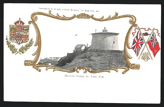 AK St. John /N. B., Martello Tower, Coat of Arms and Flags