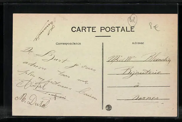 Personenbezogene Daten auf der Rückseite der Karte wurden durch blauen Textmarker unkenntlich gemacht. Die blauen Stellen sind auf die Vorderseite durchgeweicht und wirken sich negativ auf das Postkartenfoto aus