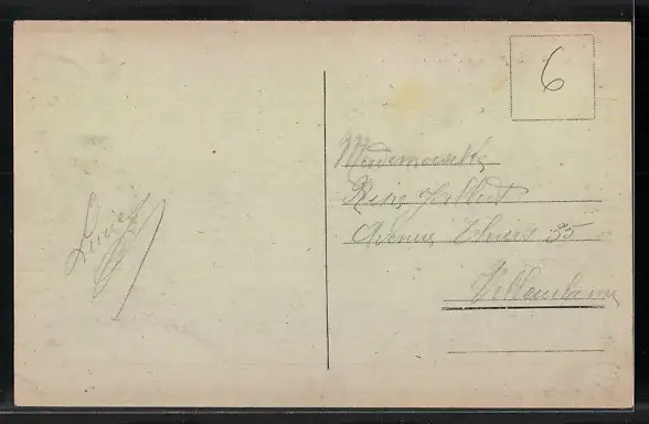 Personenbezogene Daten auf der Rückseite der Karte wurden durch blauen Textmarker unkenntlich gemacht. Die blauen Stellen sind auf die Vorderseite durchgeweicht und wirken sich negativ auf das Postkartenfoto aus