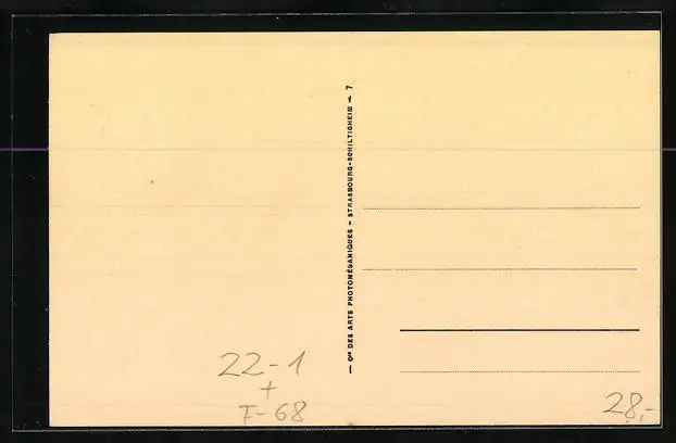 Personenbezogene Daten auf der Rückseite der Karte wurden durch blauen Textmarker unkenntlich gemacht. Die blauen Stellen sind auf die Vorderseite durchgeweicht und wirken sich negativ auf das Postkartenfoto aus