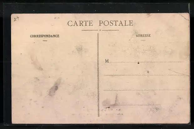 Personenbezogene Daten auf der Rückseite der Karte wurden durch blauen Textmarker unkenntlich gemacht. Die blauen Stellen sind auf die Vorderseite durchgeweicht und wirken sich negativ auf das Postkartenfoto aus