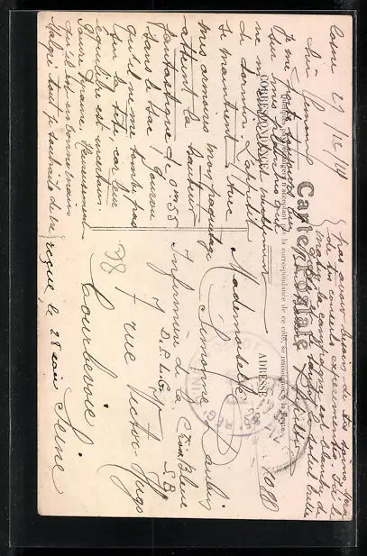 Personenbezogene Daten auf der Rückseite der Karte wurden durch blauen Textmarker unkenntlich gemacht. Die blauen Stellen sind auf die Vorderseite durchgeweicht und wirken sich negativ auf das Postkartenfoto aus