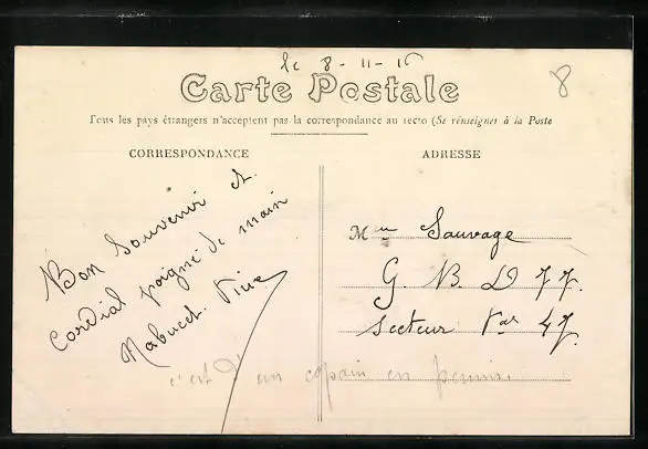 Personenbezogene Daten auf der Rückseite der Karte wurden durch blauen Textmarker unkenntlich gemacht. Die blauen Stellen sind auf die Vorderseite durchgeweicht und wirken sich negativ auf das Postkartenfoto aus